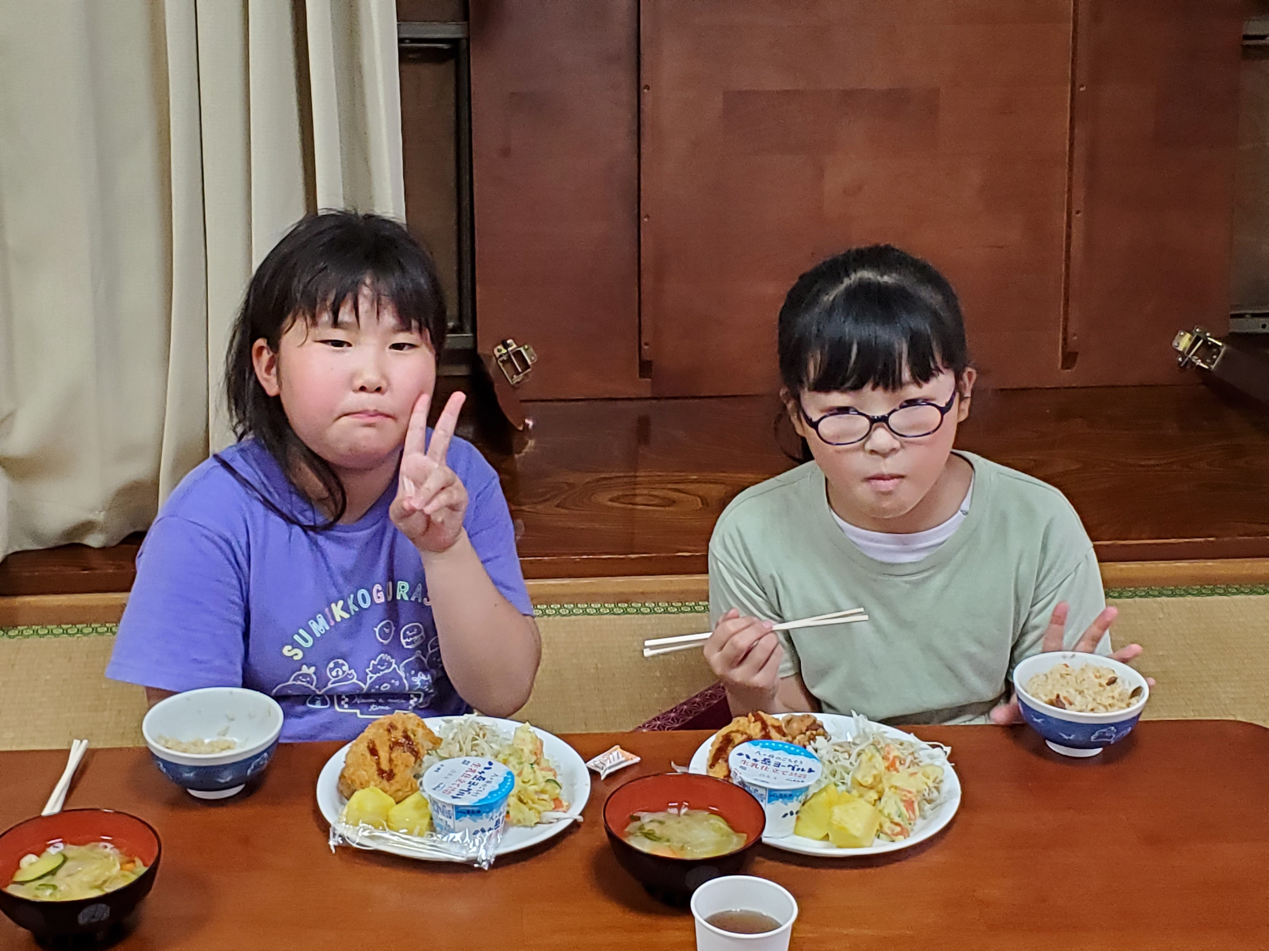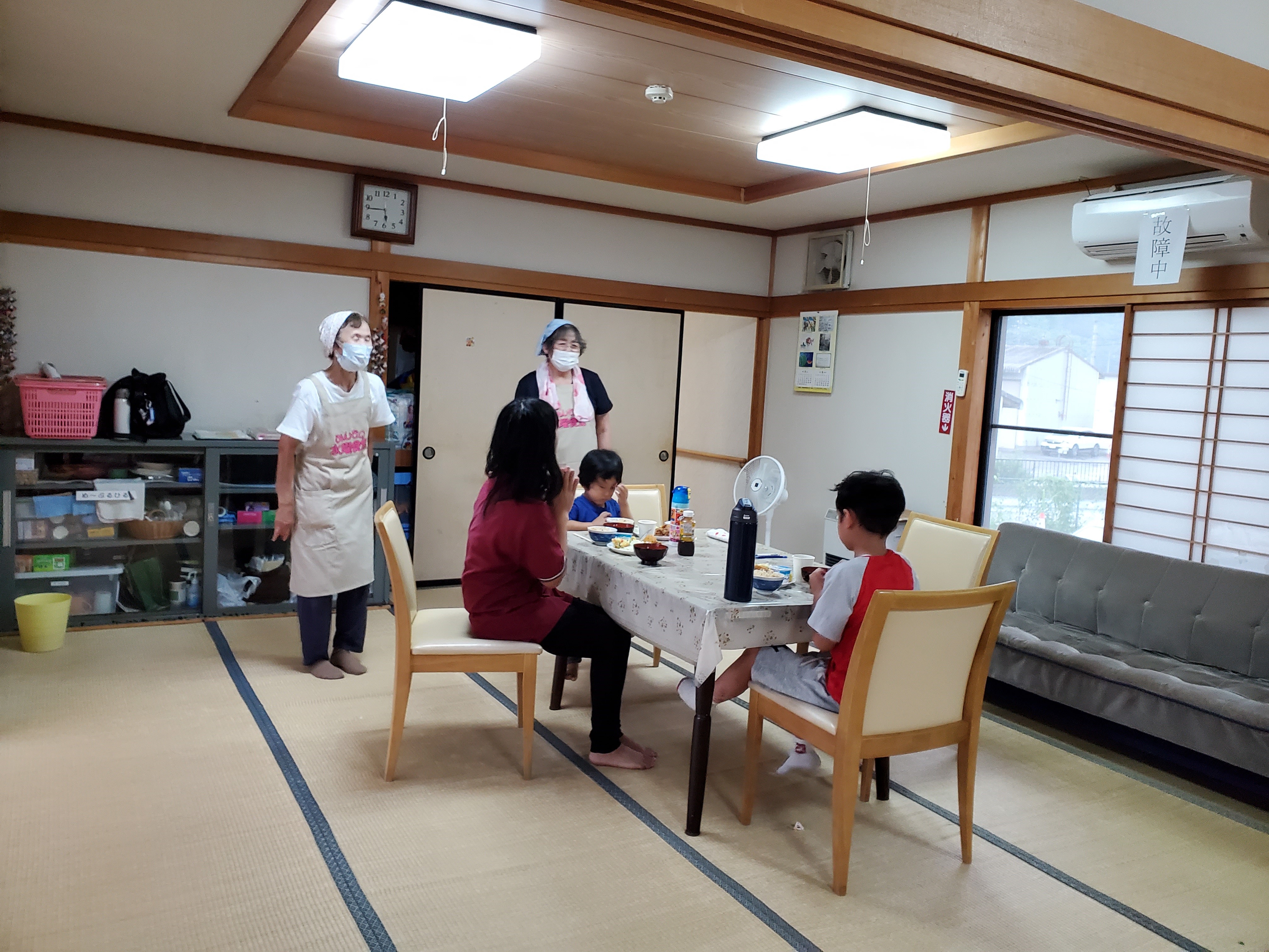 夏休み突入!?子供たちは夏休みに入り、「毎日暑い~」「もー68回事故に注意を聞いた!」等など。いろいろとあるようですが、食事を待つ間はのんびりと過ごしていました。「笑点やろう!」と座布団を出しましたが、結局みんなでゴロゴロ。