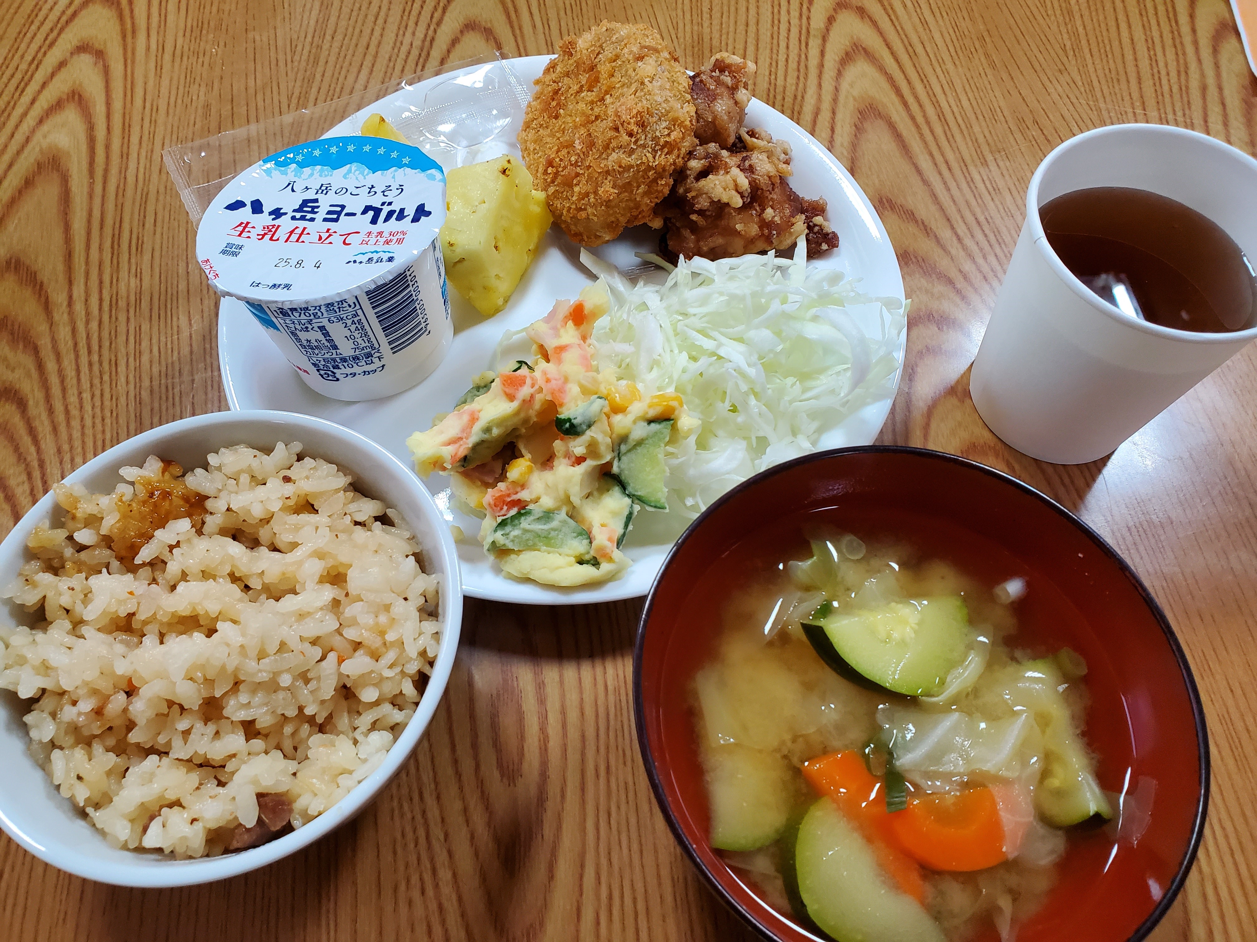 <メニュー:鶏めし、コロッケ、から揚げ、みそ汁、パイナップル、ヨーグルト>