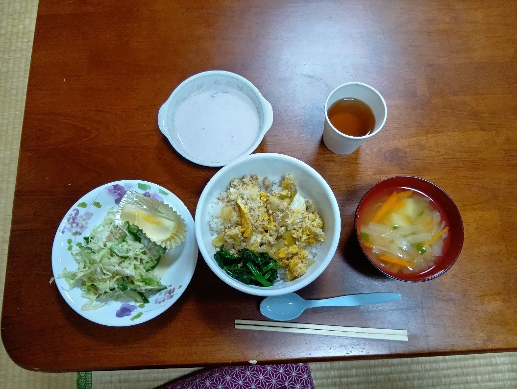 <メニュー:ひき肉丼・みそ汁・サラダ・デザート>