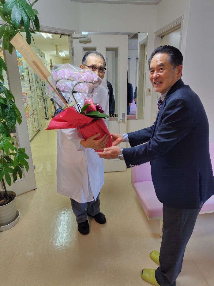 このたび、櫻井クリニック院長の櫻井慶一先生が瑞宝双光章を受章されました。医師の他にも様々な要職につかれ、日頃からご多忙な中、嬬恋村社会福祉協議会の理事としても、長年にわたり地域に寄り添い続けていらっしゃいます。そのご功績に心から敬意を表し、日ごろの感謝の気持ちを込めて記念品をお渡ししました。これからもよろしくお願い申し上げます。