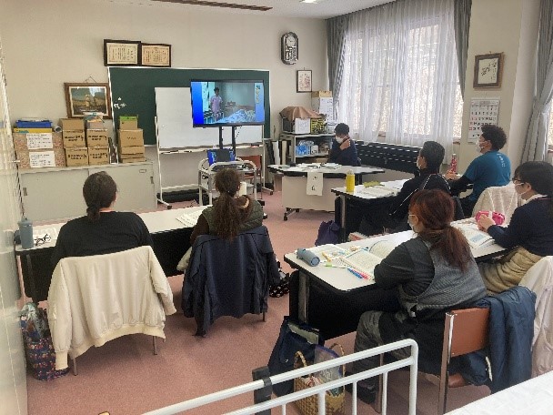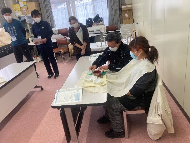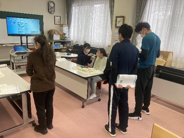 令和8年1月13日(火)、今回の講義は食事に関連した演習で、基本的な食事介助の技術伝達から始め、実習生同士で交互に介助方法の確認をしたり実際に介護食品を食べてもらったりなどして実施しました。