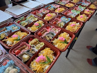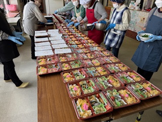 担当の大井です。3月4日(水)、今年度第3回目の80歳以上一人暮らしの方への配食サービスが行われました。今回は124食を食生活改善推進委員の皆さんにお弁当を作っていただき、ボランティアの方にお届けをしていただきました。前日に大雪が降り配達が心配されておりましたが、無事にお届けができました。ボランティアの皆さんありがとうございました。来年もお楽しみにお待ちください。