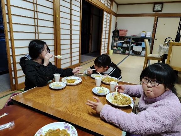 3月11日のみんなの水曜食堂の様子です。今回の参加者は14名でした。近所のウサギ小屋を訪問しました。3月とはいえ、風が冷たく戻ってからはみんなでトランプをして過ごしました。その中、水曜食堂開始から親子で参加してくださり、その後ボランティアとして昨年の3月まで協力してくださっていた方が食事に来てくれました。今はお子さんと一緒に嬬恋から離れて過ごしていますが、先日、ある人気番組にお子さんが出ていて、成長した姿を見ることができました。これも水曜食堂をやっている醍醐味ですね。また食事に来てください。今日のメニューは先週みんなで決めたチーズカレーライス。間違えてスライスチーズを購入してしまいましたが、「チーズがたっぷりでおいしい」と言って食べてくれました。