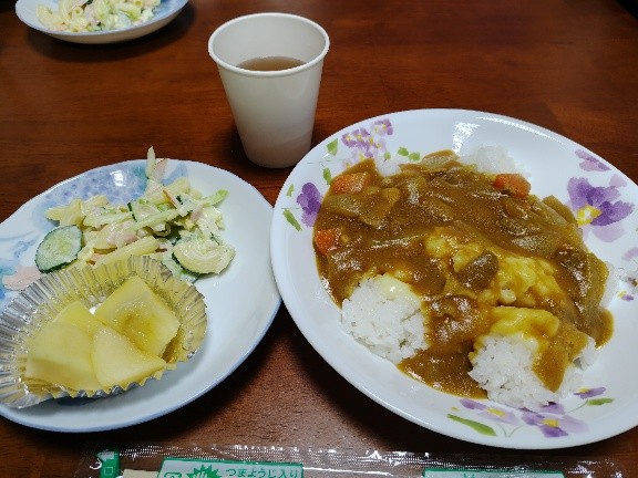 <メニュー:チーズカレーライス、マカロニサラダ、煮リンゴ>