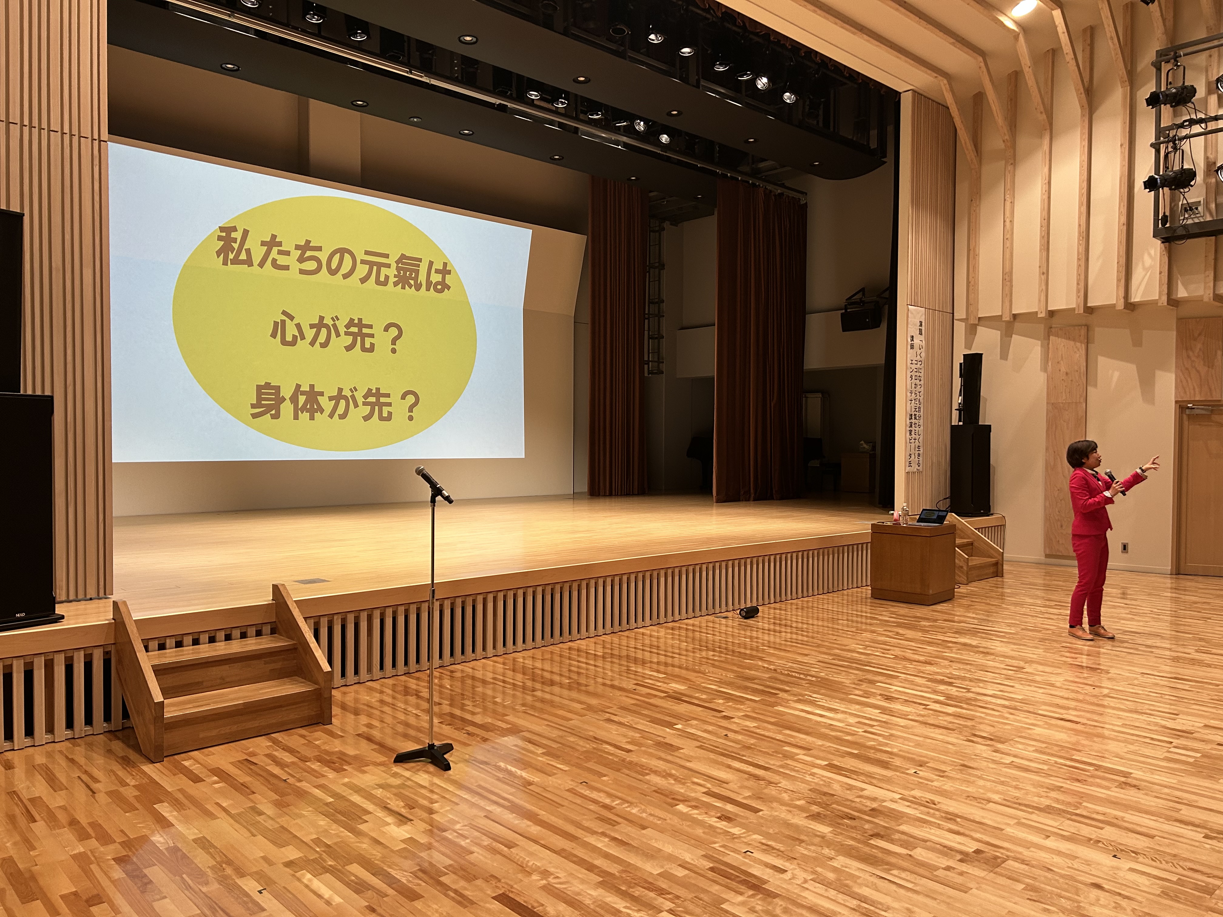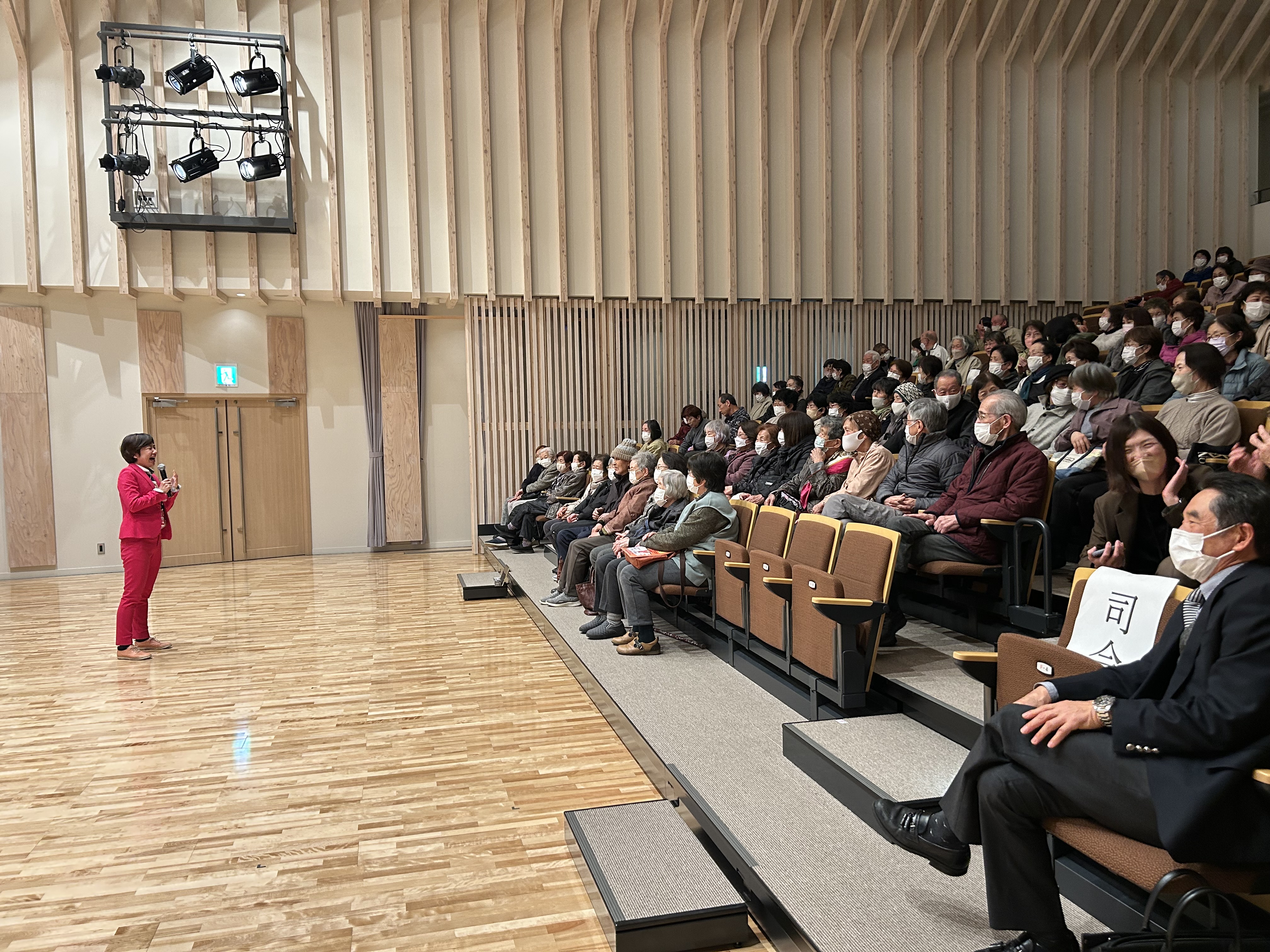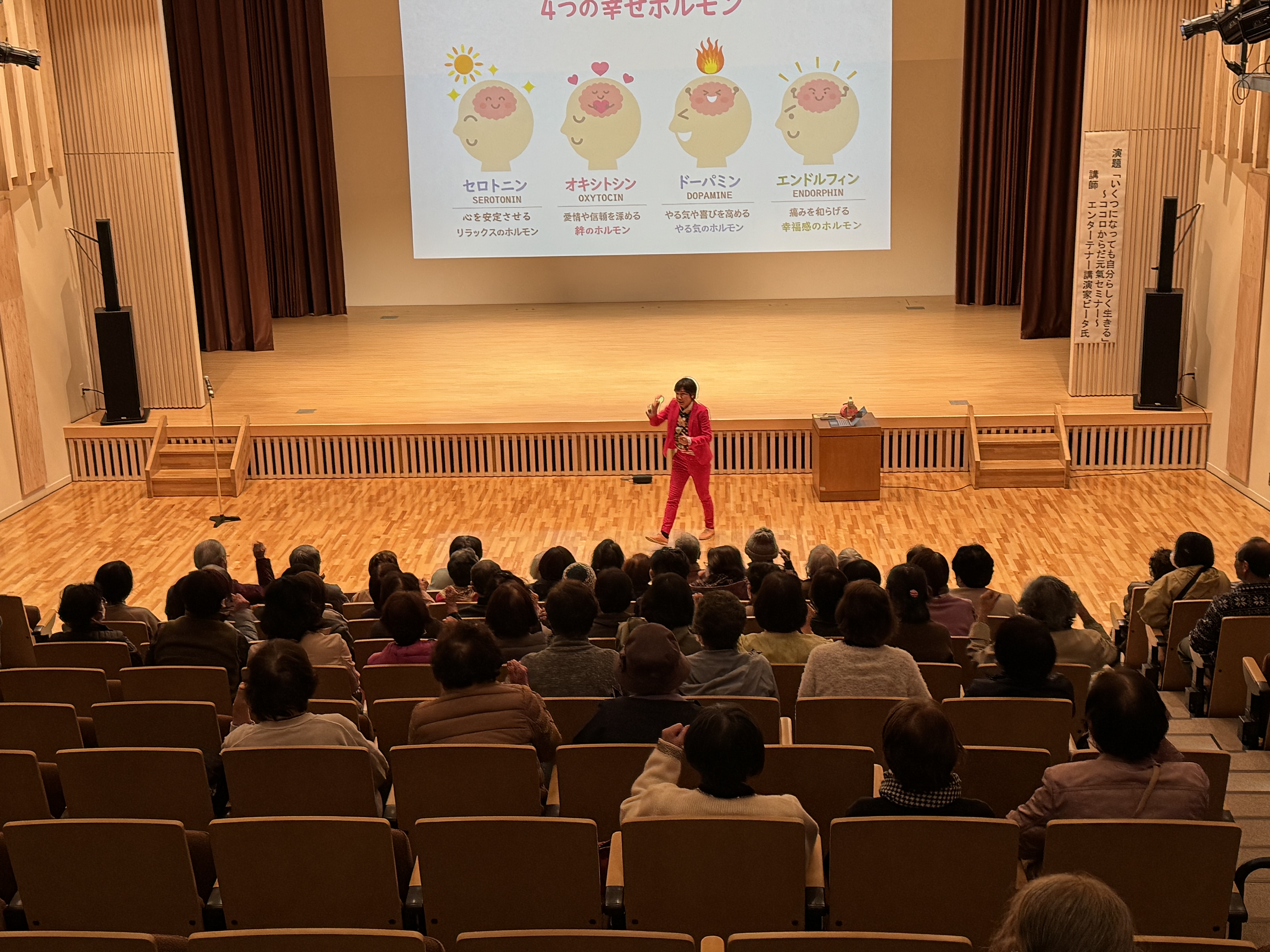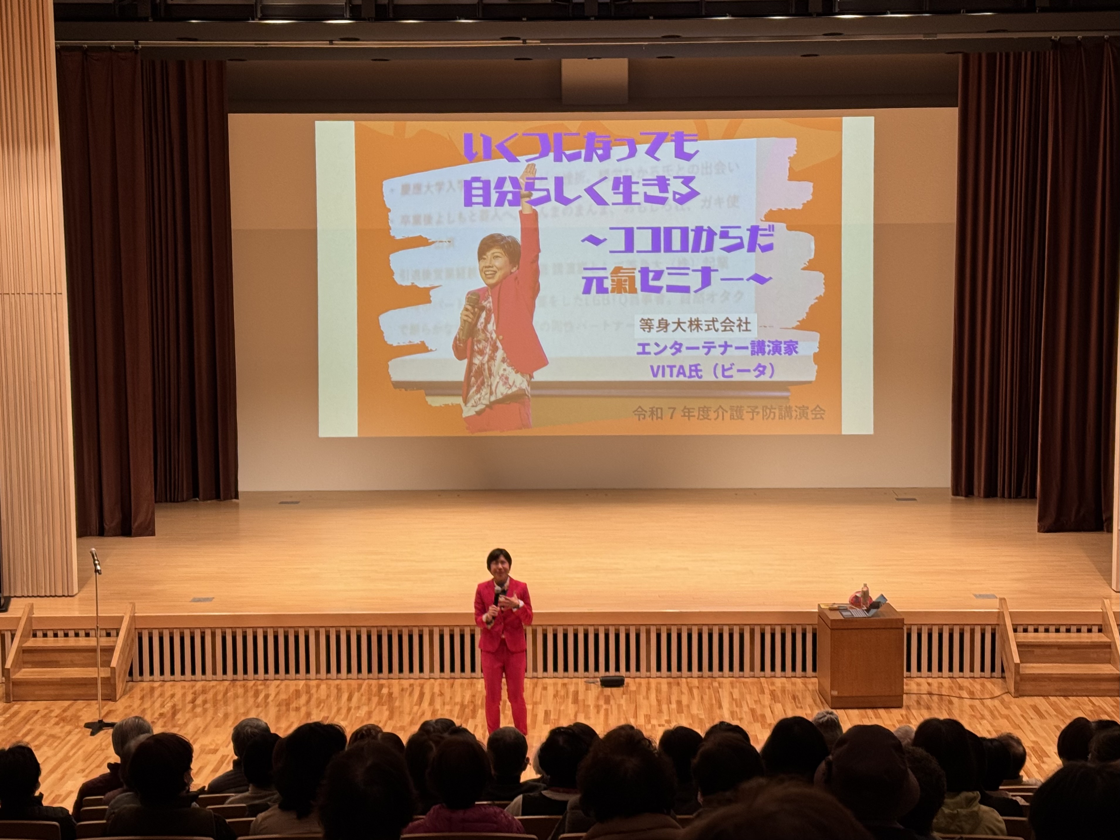 3月12日(木)、サーラ嬬恋にて、講師にエンターテナー講演家ビータ氏をお招きし「いくつになっても自分らしく生きる~ココロからだ元氣セミナー~」として介護予防講演会を開催いたしました。当日は85名の方が参加されました。思い切り笑ってしあわせホルモン大放出の楽しい講演会になりました。他人をほめることは自分をほめること。他人に話を聞いてもらうには話を聞くこと。会場が笑顔に包まれ、ほんわかした空気になりました。