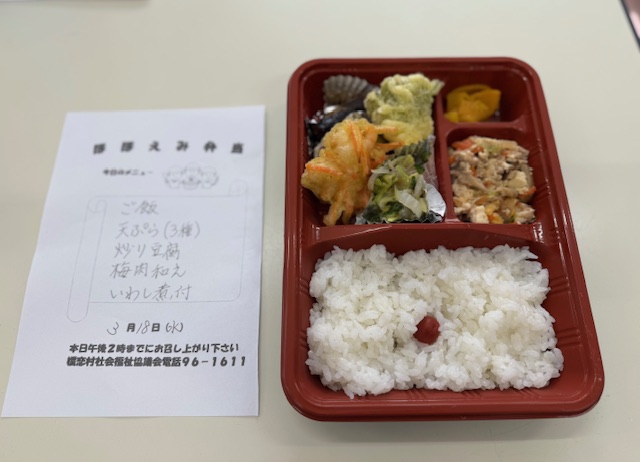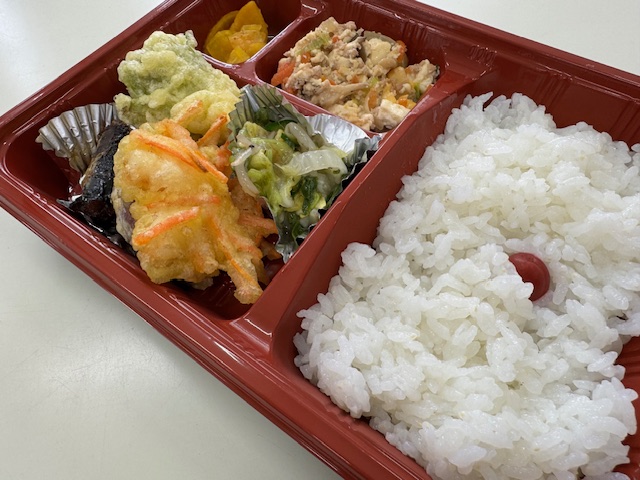 3月18日のほほえみ弁当です。メインの天ぷらはふきのとうが入っておりました。春を感じるメニューとなっております。